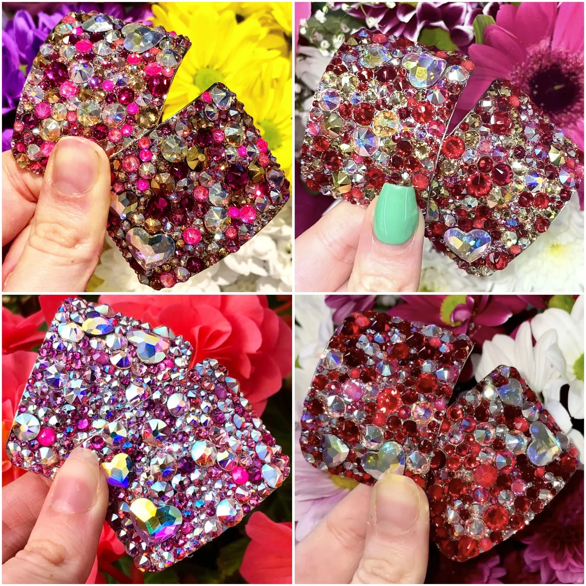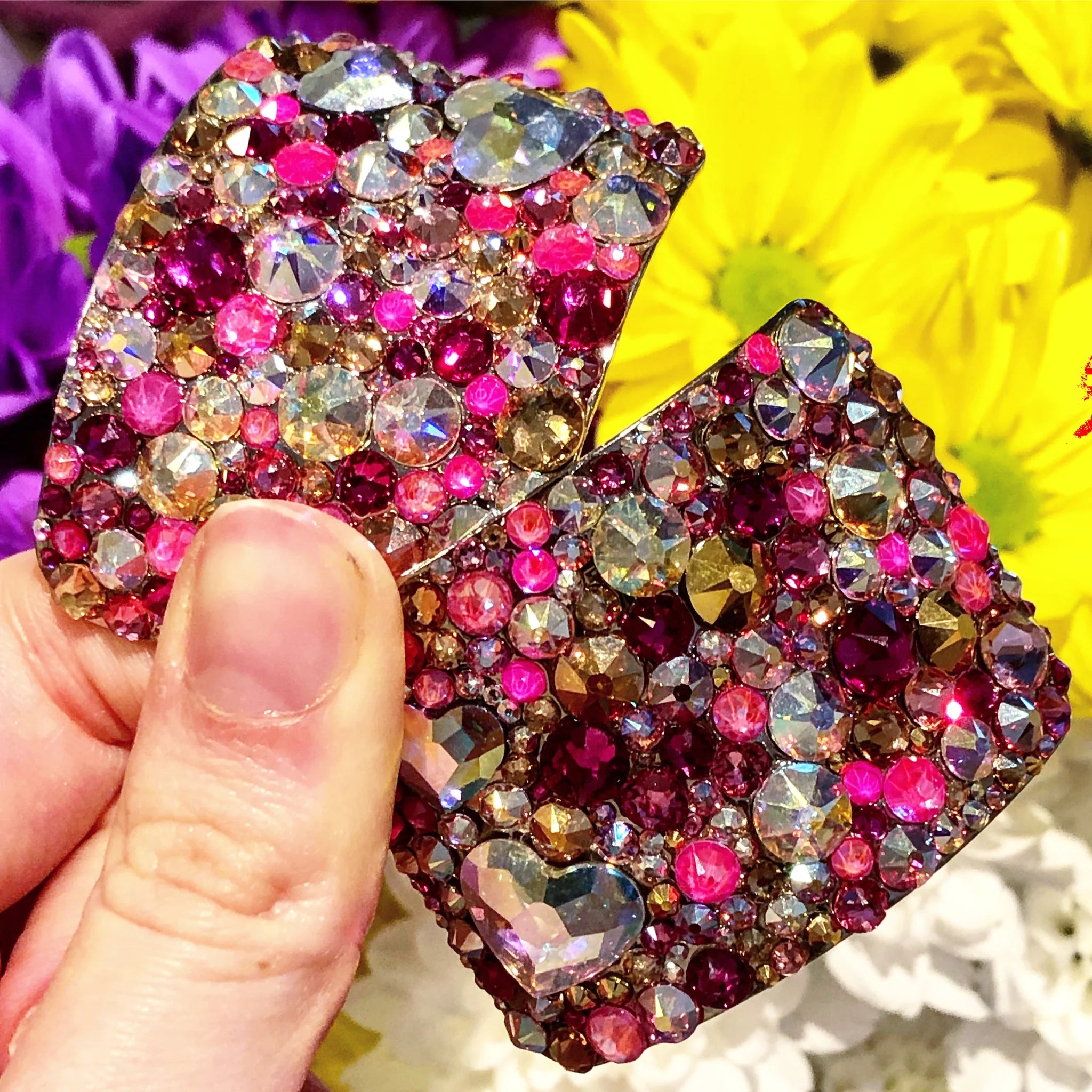 Out of this world! Match your dance dress with our Love Bug style, made by creating a tightly packed mosaic of flatback luxury crystals surrounding two hearts on each buckle.