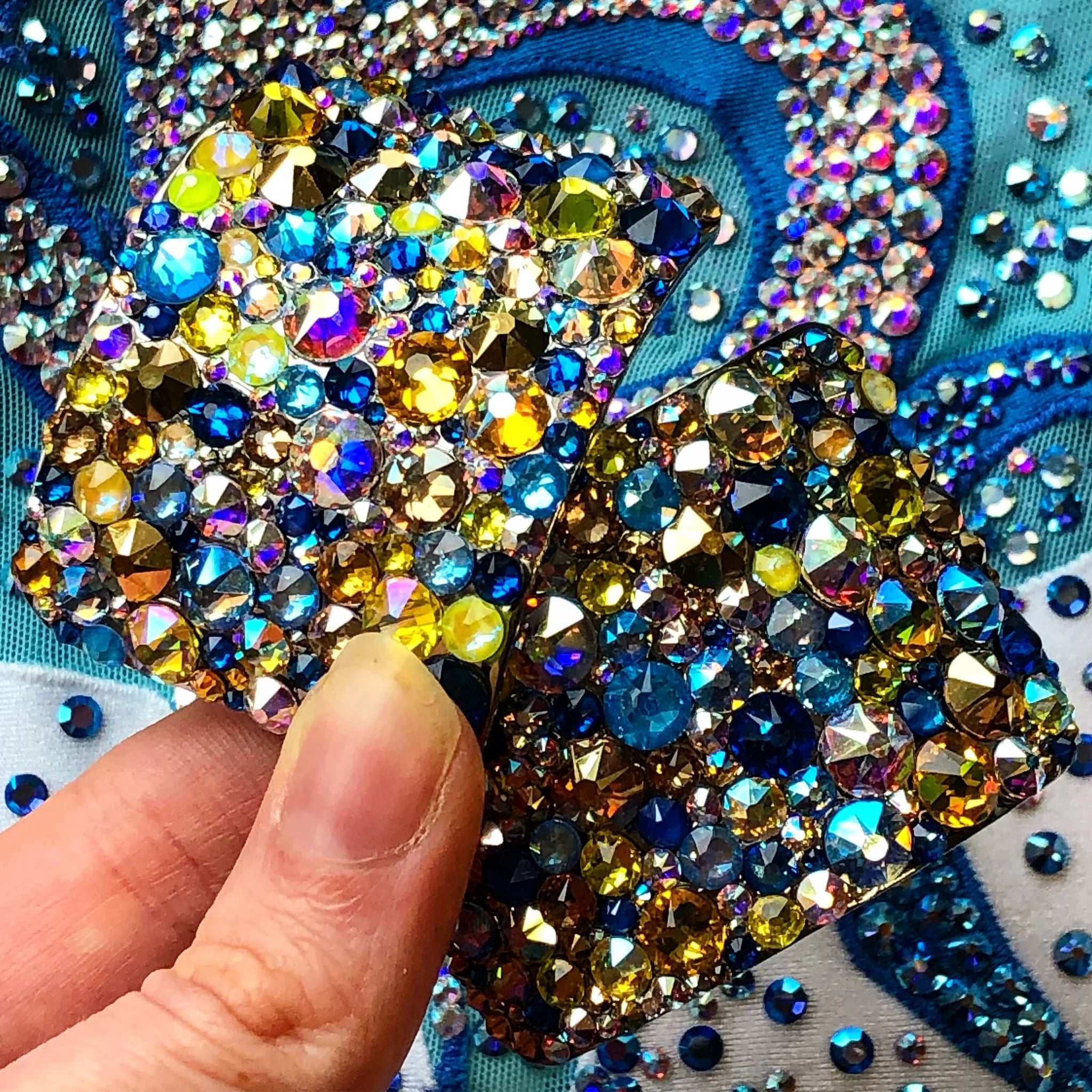 Out of this world! Match your dance dress with our Universe style, made by creating a tightly packed mosaic of flatback luxury crystals.