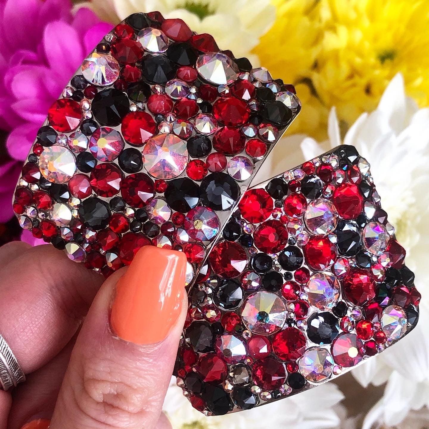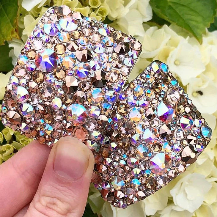 These buckles are hand stoned using flat back crystals and industrial glue making them strong and resilient. Each buckle is neatly finished with elegant lines of bling. No mess guarantee.